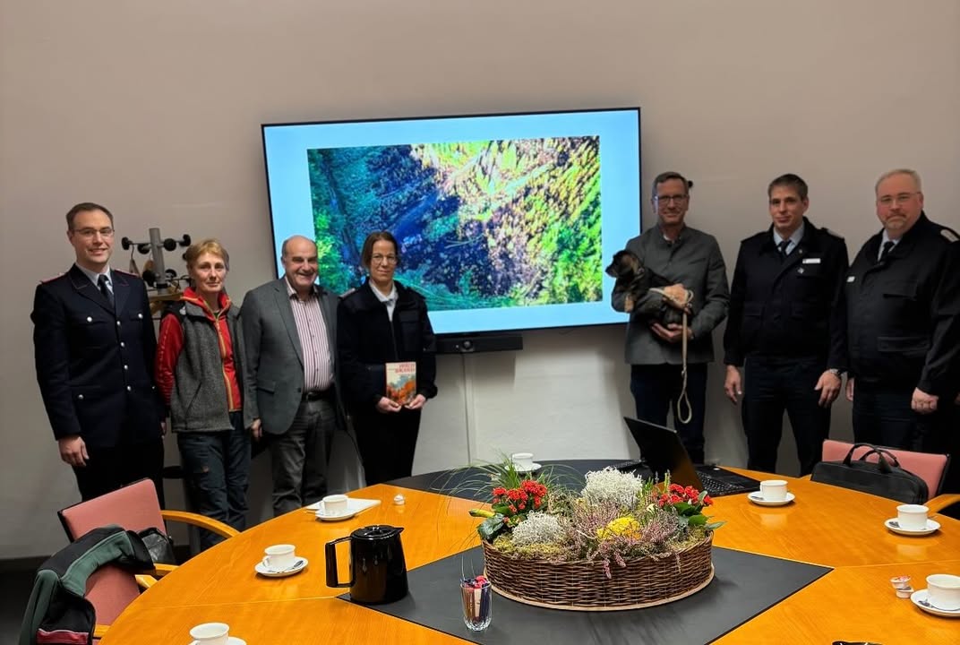 Am 18.8.2025 löschten die Freiwilligen Feuerwehren aus dem gesamten Uslarer Stadtgebiet mit Unterstützung benachbarter Kommunen einen Waldbrand bei Verliehausen, der sich über 1 ha Fläche ausgebreitet hatte, mit 100.000 Litern Wasser in einem insgesamt 28-stündigen Einsatz! Dafür bedankten sich bei einem heutigen Gespräch in der Stadtverwaltung noch einmal Forstamtsleiter Dr. Christof Oldenburg und Revierförsterin Patricia Rothhämel von den Niedersächsischen Landesforsten bei Martin Dreier, Michael Kuttig, Sascha Nolte und Christine Schiebler vom Stadtkommando und Ortskommando Verliehausen als Vertreter der Freiwilligen Feuerwehren!